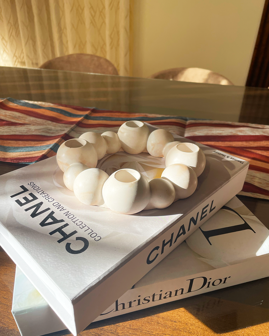 A handcrafted candle holder featuring our signature beaded form in warm sand tones, designed to hold taper or slim candles while adding an organic touch to any setting.