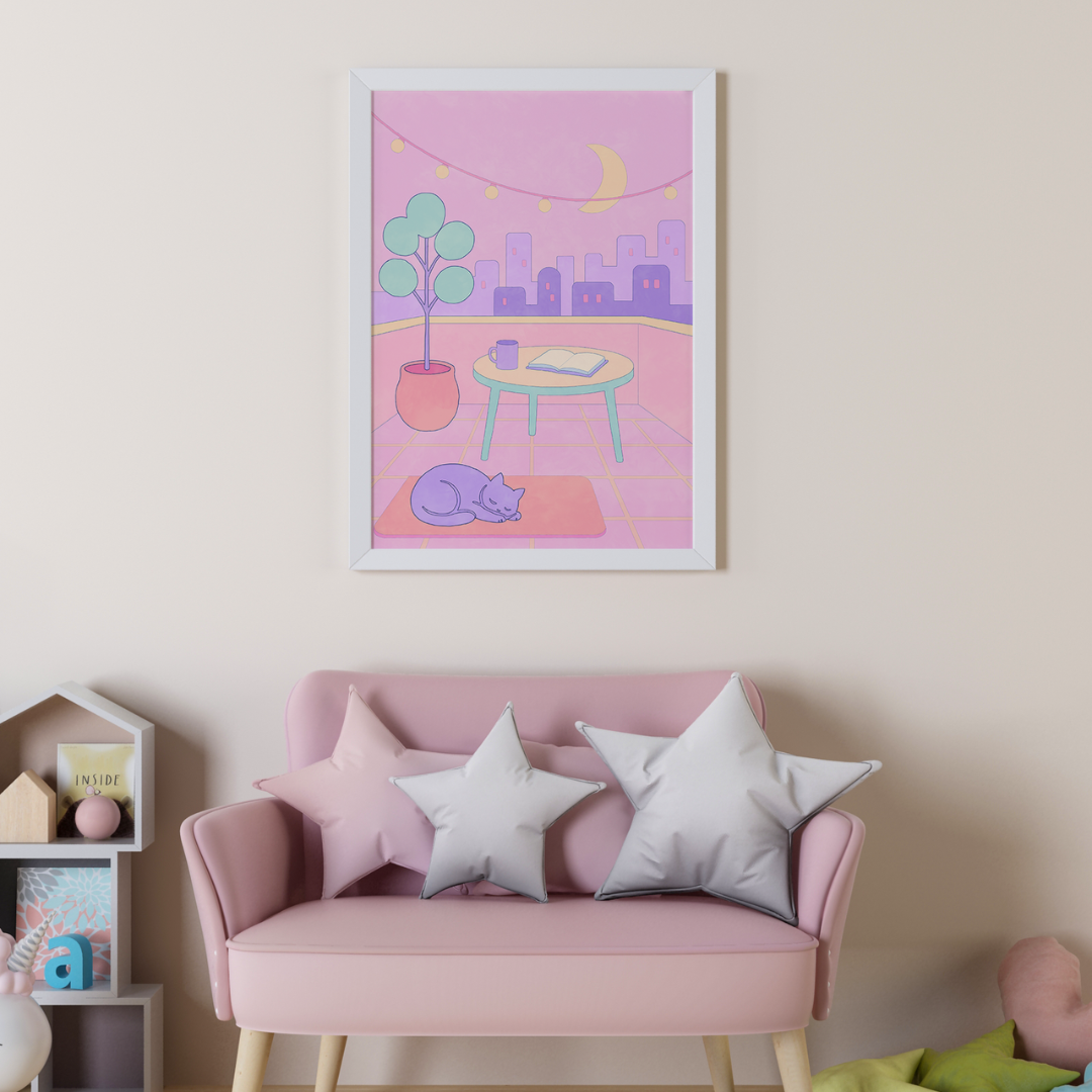 A pastel-toned escape into calm evenings, warm lights, and gentle company. Perfect for bedrooms, reading nooks, or any space that needs a touch of slow serenity.