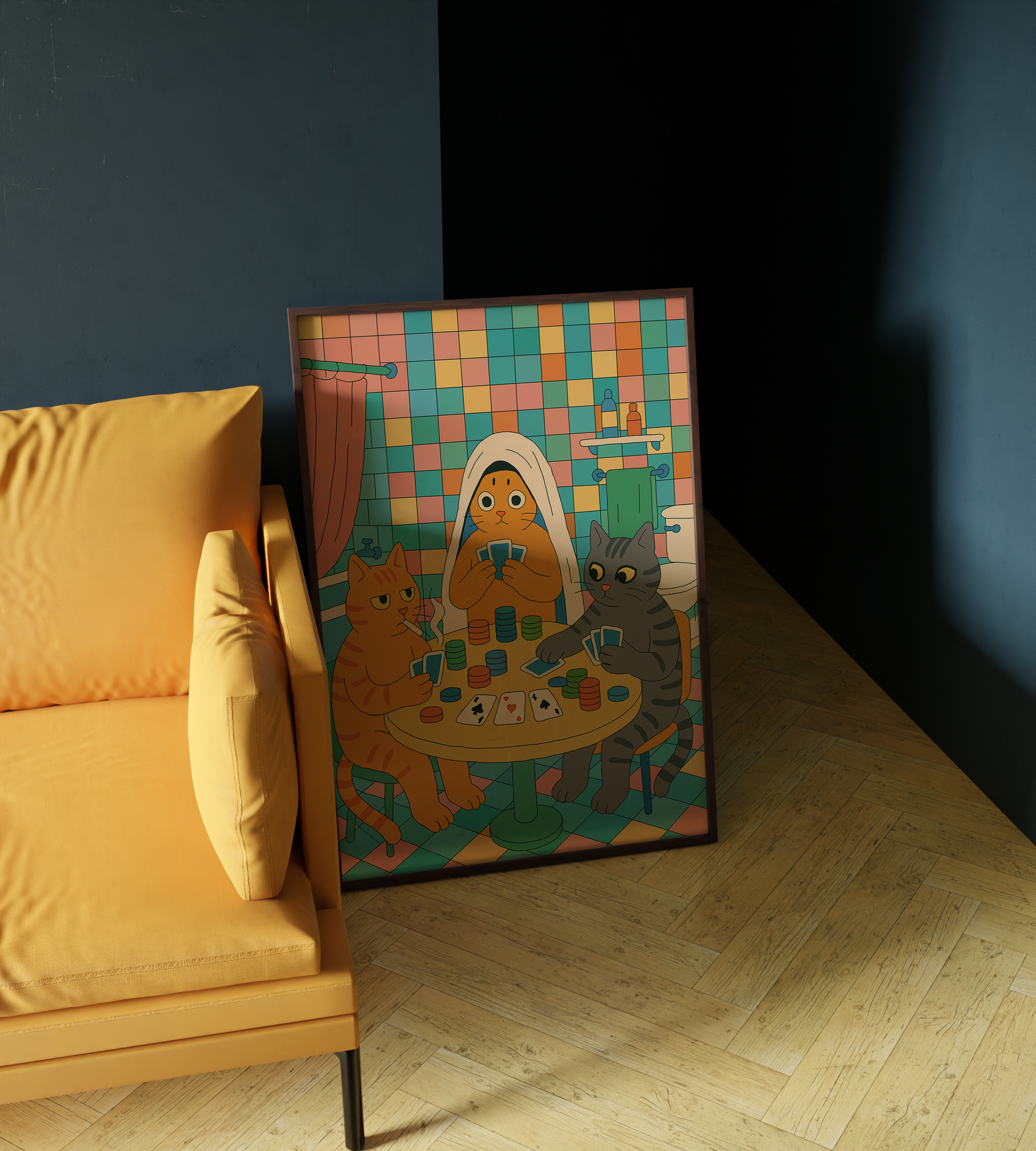“The Late Night Bluff” captures a secret scene of feline mischief, poker faces, quiet rivalry, and a hint of chaos brewing under the bathroom lights.